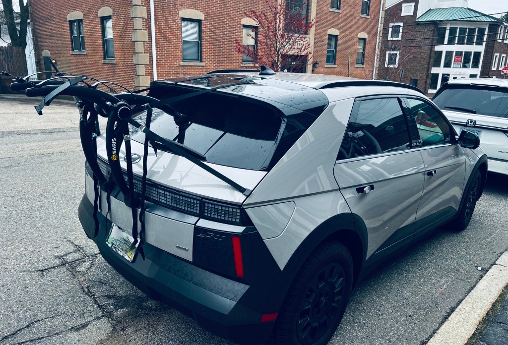 If your car starts to drift on the highway, it will automatically course-correct. The first time this happens, it’s a hair-raising surprise, like KITT wrestling control from Michael Knight. The car will also stop, suddenly, if you seem to approach an obstruction too fast. These features might very well save your life, but the car also beeps at almost any external stimulus; parallel parking throws the car into a noisy panic (your skills in this area probably don’t help). Goofiest of all is your bike rack: If you mount your bicycle on the trunk, the Ioniq 5 will assume something is positioned directly behind you and refuse (at first) to reverse at all.